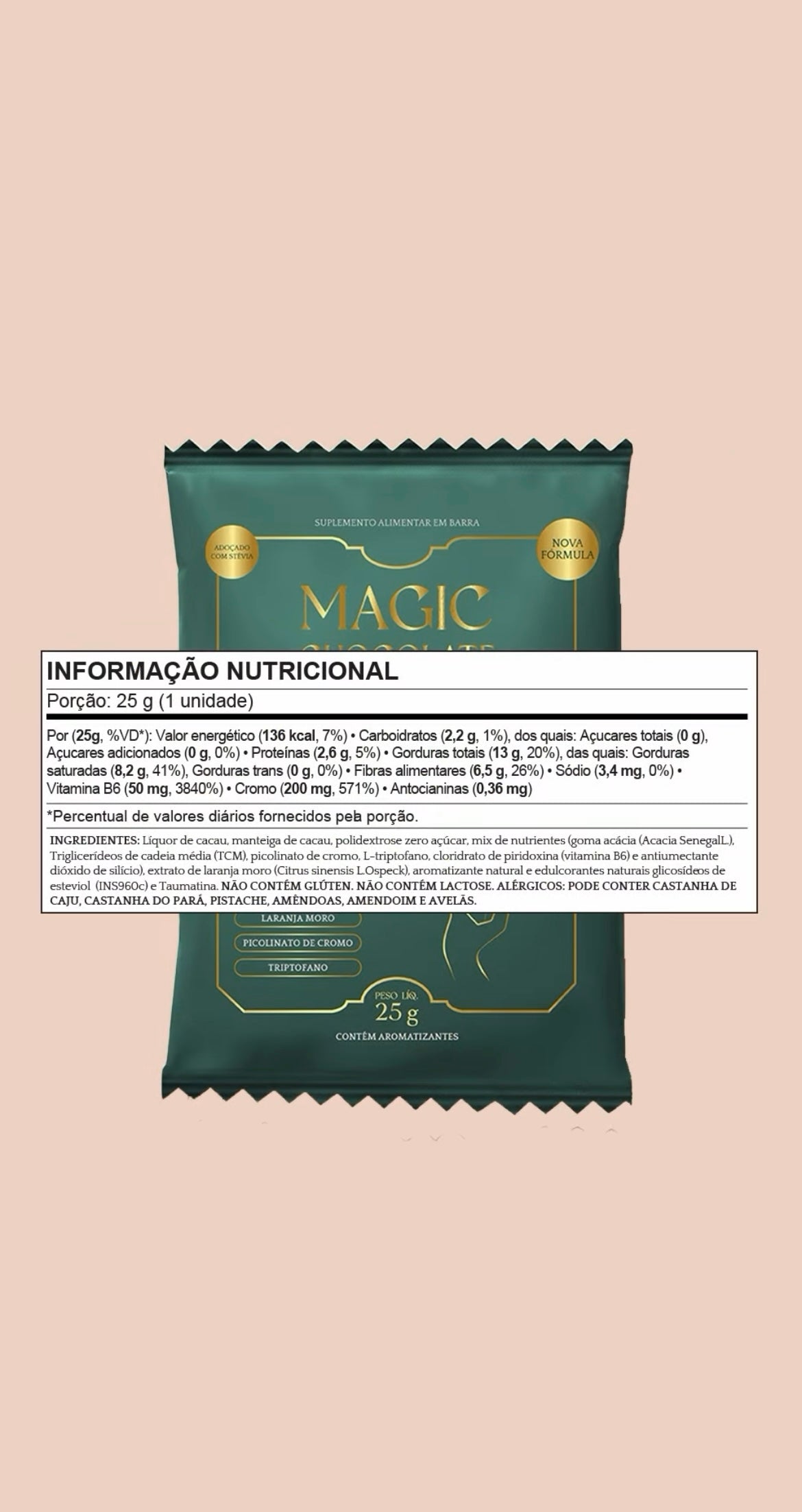 Sua base, como todos os magic chocolates é massa de cacau, manteiga de cacau, stévia e taumatina, com um blend de 6 suplementos incríveis: