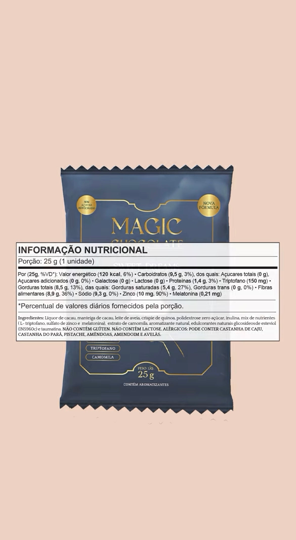 Líquor de cacau, manteiga de cacau, leite de aveia, crispie de quinoa, mix de nutrientes (vitamina C), L- triptofano, bisglicinato de zinco, melatonina, extrato de camomila, semente de uva, fibras, stévia e taumatina, e aroma natural de vanilla. NÃO CONTÉM GLÚTEN. NÃO CONTÉM LACTOSE.